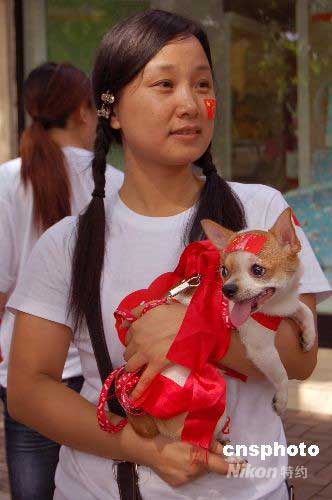 一名女孩帶著一身披紅的寵物小狗在街頭等待奧運(yùn)圣火到來。中新社發(fā) 劉萬強(qiáng) 攝