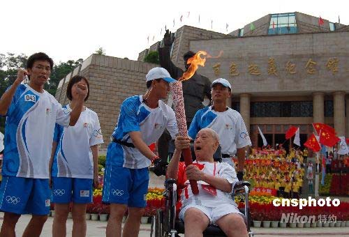 6月8日下午,奧運圣火在廣西百色市傳遞,當(dāng)?shù)啬挲g最大的火炬手、九十二歲的老紅軍牟一琳坐在輪椅上,在百色起義紀(jì)念館前舉起了“祥云”火炬。百色是鄧小平軍事生涯的起點,一九二九年鄧小平在百色領(lǐng)導(dǎo)發(fā)動了著名的百色起義。中新社發(fā) 劉萬強 攝