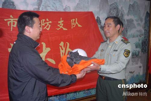 6月9日,中國(guó)國(guó)家博物館在沈陽消防支隊(duì)舉行了抗震救災(zāi)相關(guān)實(shí)物和資料收藏的交接儀式,四川抗震救災(zāi)中沈陽消防支隊(duì)特勤大隊(duì)隊(duì)旗、大隊(duì)長(zhǎng)李忠海的防護(hù)服(含頭盔)和隊(duì)員的戰(zhàn)地日記等成為了中國(guó)國(guó)家博物館永久性收藏品。這是中國(guó)國(guó)家博物館首次收藏四川抗震救災(zāi)實(shí)物和資料。在四川抗震救災(zāi)中,沈陽市消防局特勤大隊(duì)是中國(guó)第一支進(jìn)入北川縣的救援隊(duì)。中新社發(fā) 沈警 攝