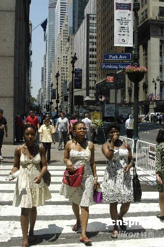 6月10日,紐約當?shù)貧鉁剡_到華氏97度,較往年6月日均最高氣溫高出十幾度。熱浪襲人,紐約當?shù)鼐用窈陀慰图娂娗鍥鲅b扮,消磨酷暑。中新社發(fā) 魏晞 攝
