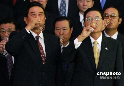 海峽兩岸關系協(xié)會會長陳云林(右)與臺灣海峽交流基金會董事長江丙坤在簽署“兩岸周末包機”和“大陸居民赴臺旅游”協(xié)議后,共飲“慶功酒”。中新社發(fā) 任晨鳴 攝
