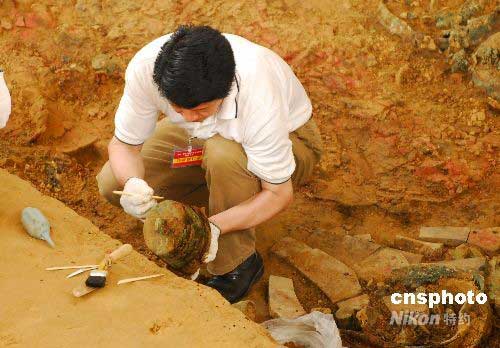 考古人員正在提取編鐘。中新社發(fā) 從啟 攝