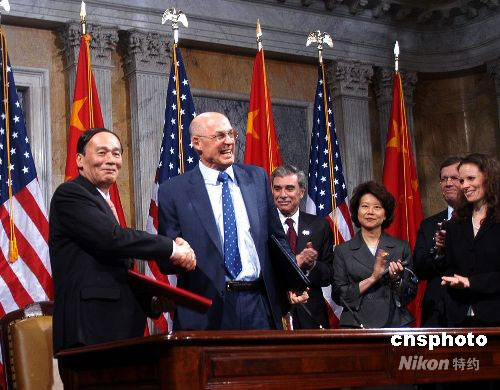 當(dāng)?shù)貢r(shí)間6月18日,中美在華盛頓簽署《中美能源環(huán)境十年合作框架》文件。圖為中國副總理王岐山和美國財(cái)政部長保爾森在簽字儀式上。中新社發(fā) 管黎明 攝