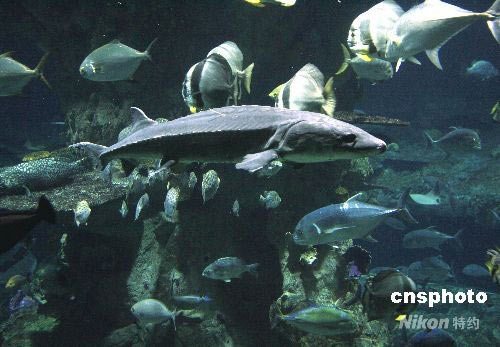 六月二十日,香港海洋公園舉行隆重的儀式迎接尊貴的新成員,國家一級保護及瀕危動物的史前魚類中華鱘(圖中)。中華鱘的歷史可追溯到一億四千萬年前的白堊紀時代,是目前地球上最古老的脊椎動物之一,有“活化石”之稱。由于其受精卵存活率很低,加上成熟期需要經(jīng)過十年,所以目前中華鱘處于瀕危狀態(tài)。中新社發(fā) 王麗南 攝