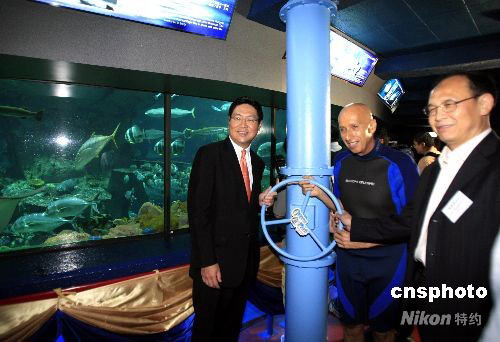香港特區(qū)商務(wù)及經(jīng)濟(jì)發(fā)展局局長(zhǎng)馬時(shí)亨(左)、全國(guó)水生野生動(dòng)物保護(hù)分會(huì)會(huì)長(zhǎng)李彥亮(右)、海洋公園主席盛智文在海洋公園海洋館為中華鱘新居揭幕。中新社發(fā) 王麗南 攝