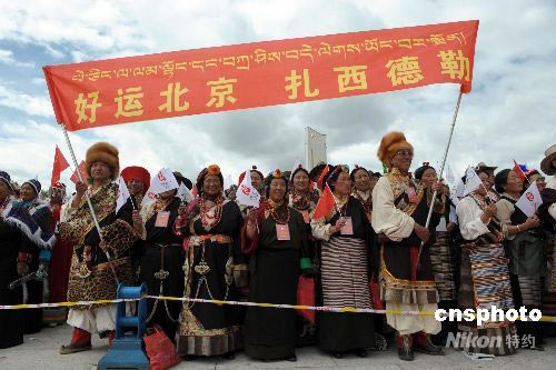 圖:藏族民眾高舉標(biāo)語祝福北京奧運(yùn)