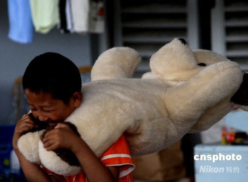 避難小男孩背著贈送的毛絨玩具玩耍。中新社發(fā) 賈國榮 攝