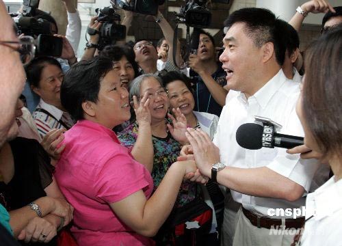 6月24日,臺北市長郝龍斌在上海城市規(guī)劃館參觀訪問時,邂逅臺灣鄉(xiāng)親旅游團(tuán),郝龍斌高興地向鄉(xiāng)親問好,相互問候祝愿熱情連連。中新社發(fā) 潘索菲 攝