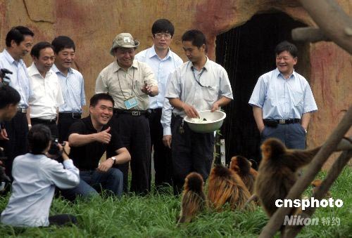 6月25日上午,臺(tái)北市長郝龍斌一行到上海野生動(dòng)物園,看望大熊貓和金絲猴。郝龍斌希望上海的大熊貓和金絲猴能落戶臺(tái)北,此外臺(tái)北的紅毛猩猩、白毛長臂猿能來到上海。并題詞:關(guān)心生態(tài)愛護(hù)野生動(dòng)物是進(jìn)步城市的重要指標(biāo)。中新社發(fā) 潘索菲 攝