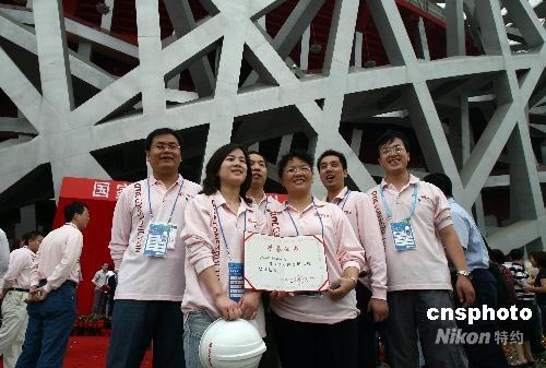 6月28日,北京奧運(yùn)會(huì)主體育場(chǎng)——國(guó)家體育場(chǎng)(“鳥巢”)落成典禮儀式在北京舉行,建設(shè)者與“鳥巢”合影。中新社發(fā) 盛佳鵬 攝