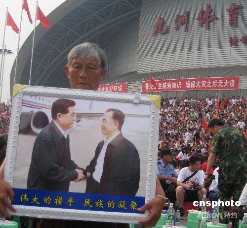 綿陽(yáng)一受災(zāi)老嫗手捧胡溫合影觀看慰問(wèn)演出