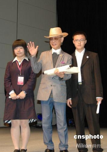 八十九歲高齡的日本漫畫家協(xié)會(huì)理事長柳瀨 嵩向來自南山中學(xué)的學(xué)生代表勾梁丁、蘇思宇同學(xué)表達(dá)深切的問候,并接受了兩位同學(xué)的禮物--南山中學(xué)的畫冊(cè)。中新社發(fā) 朱沿華 攝