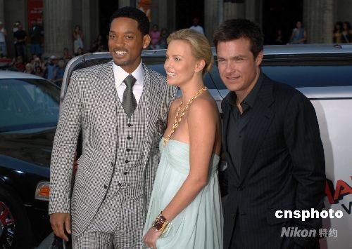 當(dāng)?shù)貢r(shí)間六月三十日晚,索尼電影公司出品的喜劇動(dòng)作片《全民超人》(Hancock)在好萊塢中國劇場舉行盛大首映式,明星紅地毯走秀規(guī)?氨葕W斯卡頒獎(jiǎng)禮。圖為影片男主角扮演者威爾·史密斯(左)、女主角扮演者查理茲·塞隆和男二號扮演者杰森·貝特曼共同出席首映式。中新社發(fā) 張煒 攝