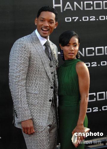 圖為《全民超人》男主角漢考克的扮演者好萊塢著名影星威爾·史密斯(Will Smith)與妻子賈達·萍克·史密斯一起出席首映禮。中新社發(fā) 張煒 攝