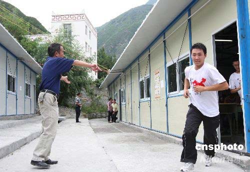 理縣中學(xué)高考考點(diǎn)的監(jiān)考老師正在指揮學(xué)生進(jìn)行余震緊急疏散演習(xí)。中新社發(fā) 黃榮 攝