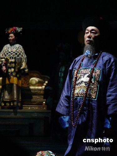 7月3日晚,香港話劇團帶來的經(jīng)典話劇《德齡與慈禧》登陸北京國家大劇院。老牌影星曾江扮演的榮祿戲份雖然不多,卻絲絲入扣。中新社發(fā) 應(yīng)妮 攝