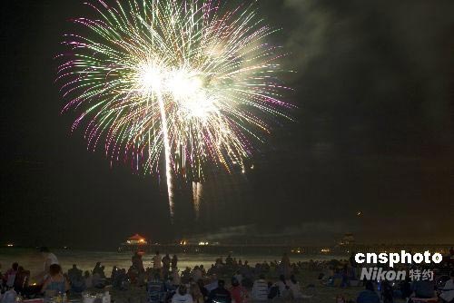 七月四日是美國(guó)獨(dú)立日,當(dāng)晚,美麗的煙花在美國(guó)南加州海灘上空綻放,數(shù)以萬計(jì)的民眾在海灘觀看煙花表演。據(jù)美國(guó)煙花協(xié)會(huì)透露,目前美國(guó)百分之九十八的普通煙花來自中國(guó),百分之八十的專業(yè)煙花來自中國(guó)。獨(dú)立日燃放煙花已經(jīng)成為美國(guó)的傳統(tǒng)民俗。中新社發(fā) 張煒 攝