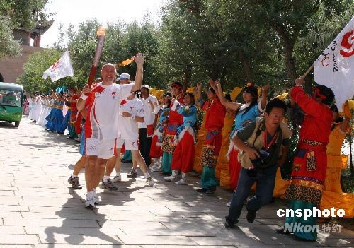第201棒火炬手、德國汽車工程師羅曼在嘉峪關關城內傳遞。中新社發(fā) 周兆軍 攝