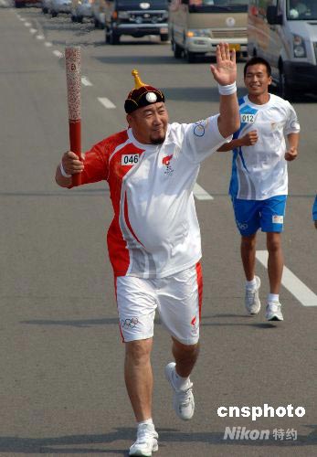 圖:摔跤冠軍沙那順格日勒傳遞奧運(yùn)火炬
