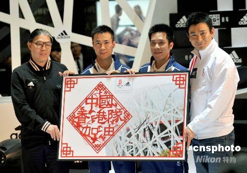 七月八日,香港體育協(xié)會暨奧委會會長霍震霆、香港“乒乓孖寶”李靜、高禮澤及劉德華在香港時代廣場出席adidas“專為北京打造”奧運(yùn)產(chǎn)品展覽開幕儀式,歌影紅星劉德華致送一幅寫上“中國、香港隊加油”的剪紙予李靜、高禮澤,以展示港人對中國及香港奧運(yùn)代表隊的支持。中新社發(fā) 鄧慶樂 攝