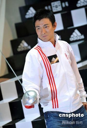 七月八日,北京奧運(yùn)會(huì)合作伙伴adidas在香港舉行“專為北京打造”奧運(yùn)產(chǎn)品展覽開幕儀式,歌影紅星劉德華出席為活動(dòng)宣傳造勢(shì),并于活動(dòng)上模仿?lián)魟?dòng)作。 中新社發(fā) 鄧慶樂 攝