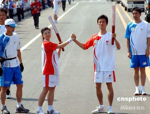 7月9日,奧運(yùn)火炬在內(nèi)蒙古鄂爾多斯進(jìn)行傳遞。圖為火炬手黃逸捷、朱小芳正在交接火炬。中新社發(fā) 廖攀 攝
