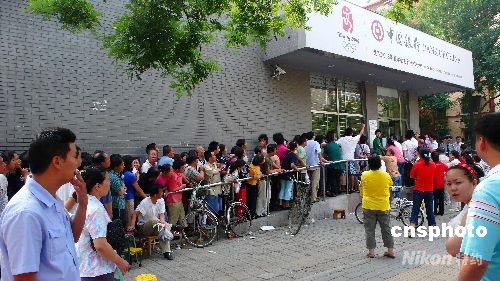 北京社區(qū)居民晝夜排隊兌換奧運紀念鈔。中新社發(fā) 張愛東 攝
