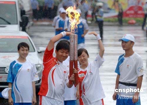 圖:奧運火炬延吉傳遞 火炬手做出愛心造型