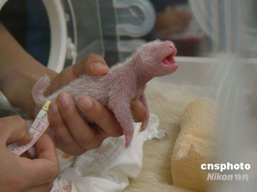 工作人員給熊貓幼仔量身長