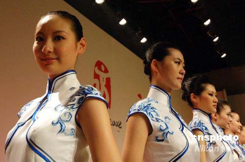 北京奧運頒獎志愿者展示“青花瓷”系列頒獎禮服,這一系列將使用在國家游泳中心、順義水上公園和青島等地舉行的所有水上項目的頒獎儀式中。中新社發(fā) 王東明 攝