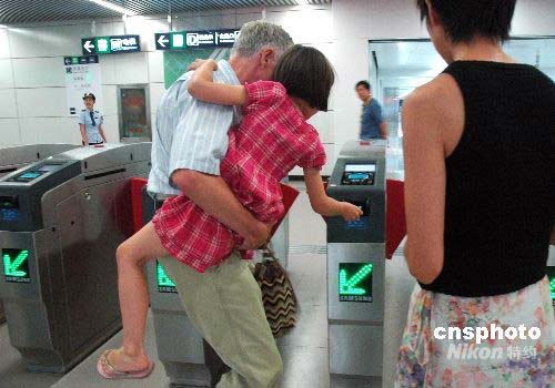 圖為在機(jī)場線三元橋車站入口處,外國游客一家人正在投票進(jìn)站。中新社發(fā) 張雙雙 攝