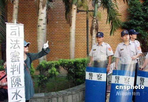 7月21日,臺灣前海軍中將雷學(xué)明等控告陳水扁等人誹謗案在臺北地方法院開庭。這是是陳水扁卸任臺灣領(lǐng)導(dǎo)人后首度至法院出庭,創(chuàng)下卸任領(lǐng)導(dǎo)人以被告出庭的首例。為此,大批警方出動維持秩序,不過仍發(fā)生陳水扁上午在步入法院時遭一民眾踹一腳的意外。圖為一民眾在以盾牌戒備的警察前手持紙牌表達(dá)觀點。中新社發(fā) 黃少華 攝