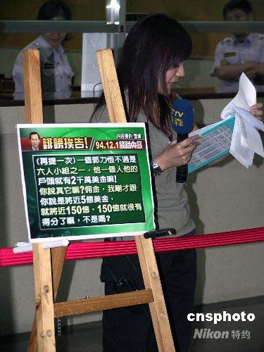 7月21日上午,臺北地方法院開庭審理臺灣前海軍軍官雷學(xué)明控告臺灣地區(qū)前領(lǐng)導(dǎo)人陳水扁等人誹謗案。這是陳水扁卸任后首度至法院出庭,臺灣媒體對此高度關(guān)注。圖為在臺北地院內(nèi),媒體制作看板,女記者在現(xiàn)場報道案情審理進(jìn)展。中新社發(fā) 徐長安 攝