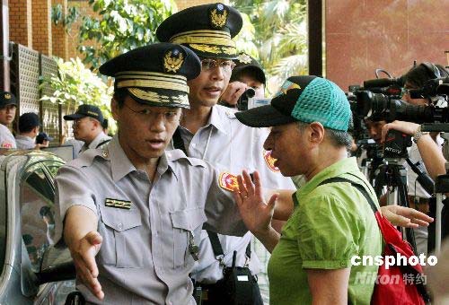 7月21日,臺灣前海軍中將雷學明等控告陳水扁等人誹謗案在臺北地方法院開庭。這是是陳水扁卸任臺灣領(lǐng)導人后首度至法院出庭,創(chuàng)下卸任領(lǐng)導人以被告出庭的首例。為此,大批警方出動維持秩序,不過仍發(fā)生陳水扁上午在步入法院時遭一民眾踹一腳的意外。圖為警方在法院門口勸離一民眾。中新社發(fā) 黃少華 攝