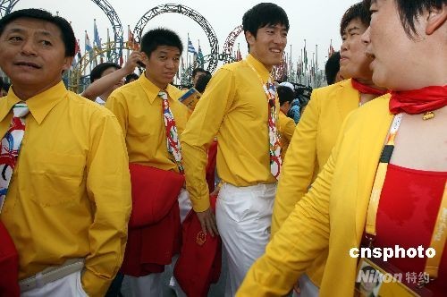 7月27日上午,北京奧運(yùn)會運(yùn)動員村正式開村,率先入駐的中國體育代表團(tuán)舉行隆重的升旗儀式。為了“躲避”眾多志愿者、工作人員的拍攝與簽名,大明星劉翔只好隱身在田徑隊的隊友中。中新社發(fā) 任晨鳴 攝