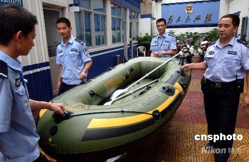 7月28日,福州一社區(qū)派出所警員調(diào)來(lái)沖鋒舟以應(yīng)對(duì)強(qiáng)臺(tái)風(fēng)“鳳凰”可能對(duì)市區(qū)造成的侵襲。中新社發(fā) 劉可耕 攝