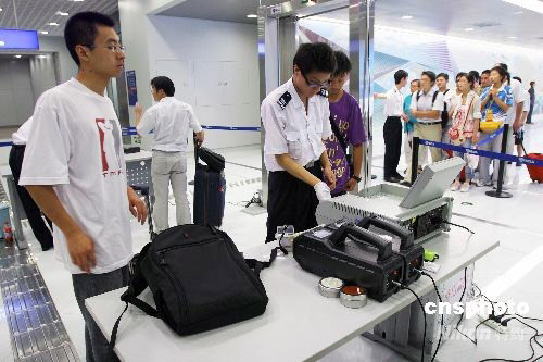7月29日,乘坐新開(kāi)行的機(jī)場(chǎng)輕軌的旅客在進(jìn)入首都機(jī)場(chǎng)航站樓時(shí),排隊(duì)接受嚴(yán)格的安保檢查。當(dāng)日距北京奧運(yùn)開(kāi)幕還有10天,北京警方加強(qiáng)安保工作。 中新社發(fā) 劉新 攝