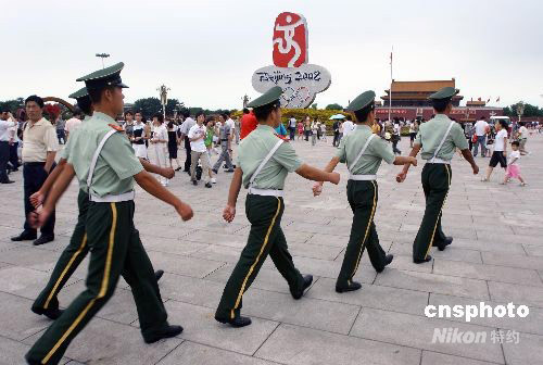 7月29日,一隊執(zhí)勤武警士兵從天安門廣場“中國印·舞動的北京”主體花壇旁巡邏經過。天安門廣場“奧運”花壇整體工程進入尾聲,奧運氣氛更濃,市民與游客紛紛至此游玩拍照,安全保衛(wèi)工作也加強,以確!捌桨矈W運”。 中新社發(fā) 劉新 攝