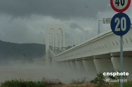 八月六日上午,受熱帶風(fēng)暴“北冕”影響,澳門掛出八號風(fēng)球,三座連接半島和離島的大橋橋面關(guān)閉,唯圖中西灣大橋的下層通道可供車輛使用。中新社發(fā) 畢永光 攝