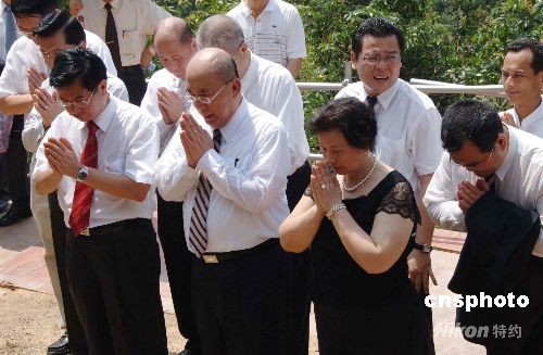 八月十四日,回到祖籍地--福建永定縣下洋鎮(zhèn)思賢村的中國(guó)國(guó)民黨主席吳伯雄,特地前往祖墳祭拜祖先。圖為吳伯雄夫婦一行向祖墳鞠躬。中新社發(fā) 鄭祚聲 攝