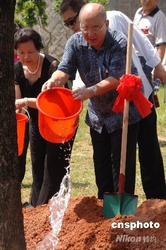八月十四日下午,中國國民黨主席吳伯雄一行在福建永定縣高北土樓群的“土樓王”承啟樓前,植樹紀(jì)念此次祖地行。圖為吳伯雄夫婦為新種下的香樟樹澆水。中新社發(fā) 鄭祚聲 攝