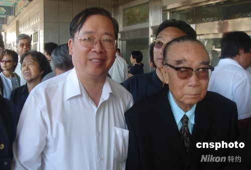 圖為90多歲高齡的中國(guó)前首任駐美大使柴澤民(右)和周恩來(lái)總理秘書(shū)羅青長(zhǎng)之子(左)出席告別儀式。中新社發(fā) 韓凱 攝