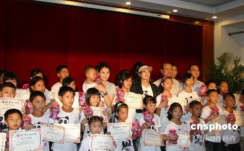 9月11日,香港華光功德會在綿陽成立“華光四川助學基金”,香港華光功德會的榮譽顧問袁詠儀、愛心大使趙薇與綿陽地震災區(qū)學生合影。中新社發(fā) 霍潺 攝
