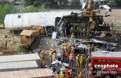 當(dāng)?shù)貢r間九月十三日上午,救援人員在嚴(yán)重受損的列車車廂里搜尋遇難者遺體。十二日下午,距離洛杉磯市中心四十公里的近郊發(fā)生一起客運(yùn)通勤列車與貨運(yùn)列車相撞的嚴(yán)重事故,至少造成26人死亡,130多人受傷。中新社發(fā) 張煒 攝