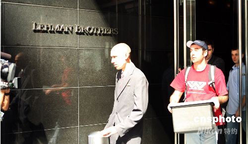 9月15日,美國(guó)有著158年歷史的第4大投資銀行雷曼兄弟公司于向法院申請(qǐng)破產(chǎn)保護(hù),員工當(dāng)日從雷曼兄弟公司位于紐約的總部大樓內(nèi)將清理的辦公用品搬離公司。中新社發(fā) 鄧悅 攝