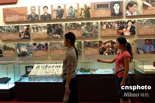 9月20日上午,中國(guó)人民革命軍事博物館青年講解員正在為“‘萬(wàn)眾一心 眾志成城’--抗震救災(zāi)主題展覽”欄目背誦講解詞。由中共中央宣傳部、國(guó)家發(fā)展和改革委員會(huì)、解放軍總政治部共同主辦的此項(xiàng)展覽,將于9月21日正式對(duì)公眾開(kāi)放。該展覽為汶川大地震后,北京舉辦的反映抗震救災(zāi)工作,規(guī)模最大,文物最多,圖片形象最為詳盡的展覽之一。中新社發(fā) 鄒憲 攝