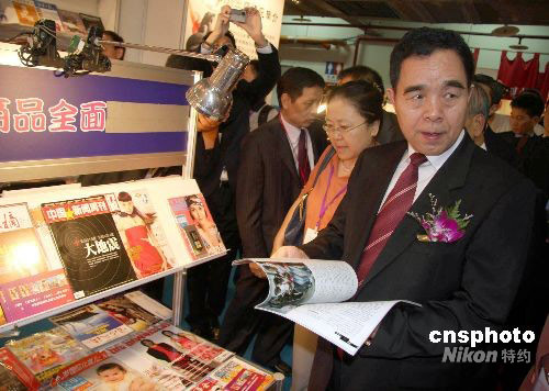 9月20日,第四屆海峽兩岸圖書交易會(huì)在臺(tái)北世貿(mào)中心三館開幕,中新社主辦的《中國新聞周刊》現(xiàn)身第四屆海峽兩岸圖書交易會(huì)。圖為大陸參訪團(tuán)團(tuán)長、新聞出版署署長柳斌杰參觀大陸期刊綜合展區(qū)時(shí),觀看《中國新聞周刊》。中新社發(fā) 陳立宇 攝