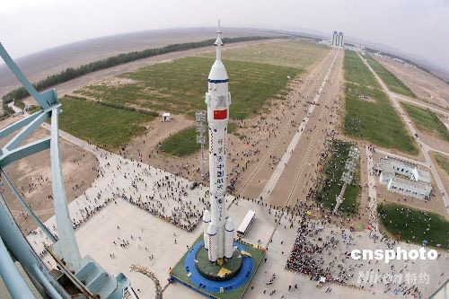 備受矚目的神舟七號(hào)載人航天飛行任務(wù)實(shí)施在即,目前,神舟七號(hào)船、箭、塔組合體已順利垂直轉(zhuǎn)運(yùn)至中國載人航天發(fā)射場(chǎng)發(fā)射架,整裝待發(fā)。中新社發(fā) 楊志遠(yuǎn) 攝