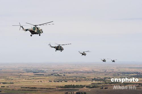 圖為參加神七返回艙搜救任務(wù)的陸航直升機(jī)展開搜救演練。中新社發(fā) 周敬波 攝