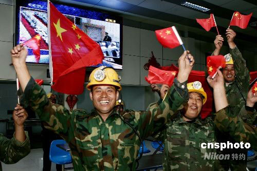 9月25日晚,安徽淮北安徽恒源煤電公司的礦工們揮舞國旗歡呼“神七”發(fā)射成功。當(dāng)日,該公司上千名礦工收看了神舟七號飛船發(fā)射的電視直播。中新社發(fā) 黃啟軍 攝